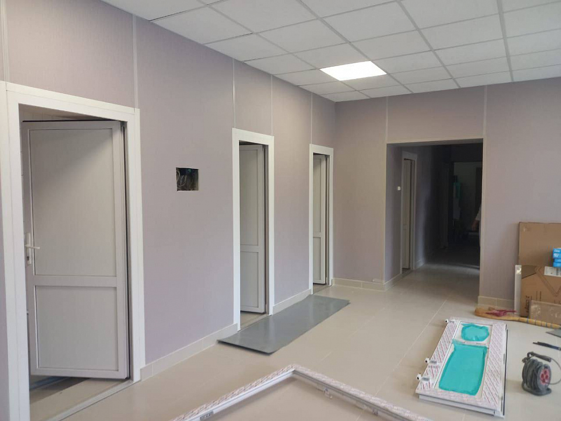 Медицинские учреждения расположены в п. Новый Городок. Работы завершатся осенью. На сегодняшний день во взрослой поликлинике ремонт фасада выполнен на 90%: заменены оконные блоки, отремонтированы входные зоны, в стадии завершения облицовка главного входа. Полностью завершены работы по замене отопительной системы и полов.