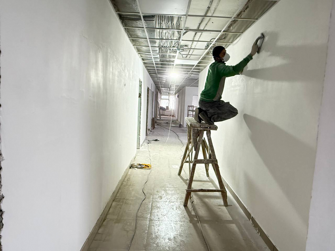 Выполнены работы по установке системы видеонаблюдения и прокладке сетей для доступа в интернет. В настоящее время в здании полным ходом идут внутренние отделочные и подготовительные работы: продолжается монтаж дверей, на лестницах устанавливают новые перила, оштукатуриваются стены.